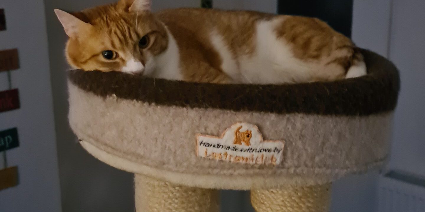 In der Regel verteilen wir uns überall, weil es in jedem Zimmer und auch draußen für uns Kratzbäume und Liegeflächen gibt. Insgesamt haben wir 7 Kratzbäume, 6 Katzenklos und noch jede Menge andere Liegeplätze. Mama hat alle Kratzbäume vom gleichen Hersteller. Sie sind massiv und man kann alle Betten und Hängematten abziehen und waschen. Teppich oder Plüsch haben wir nicht an den Kratzbäumen. Weil wir alle auch schon mal gleichzeitig auf einen Kratzbaum wollen, müssen die schon sehr stabil sein und richtig was aushalten. Der älteste Baum ist jetzt schon 10 Jahre da und immer noch super.